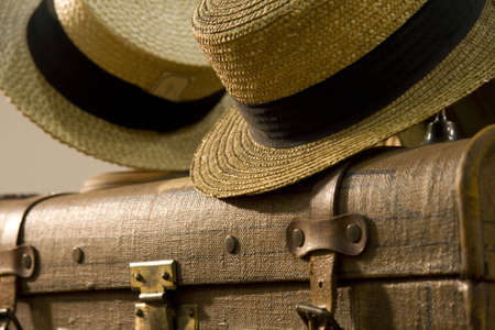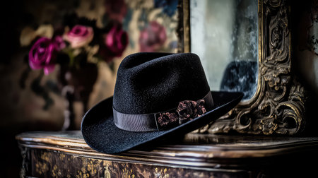 Summer men's hat on a black wooden table. Classic men's headdress.