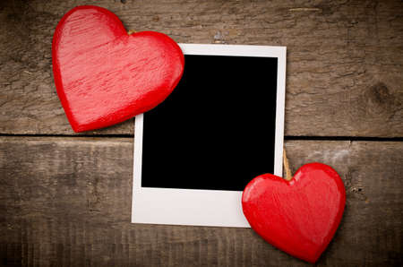 Two red wooden heart shapes with an old photograph