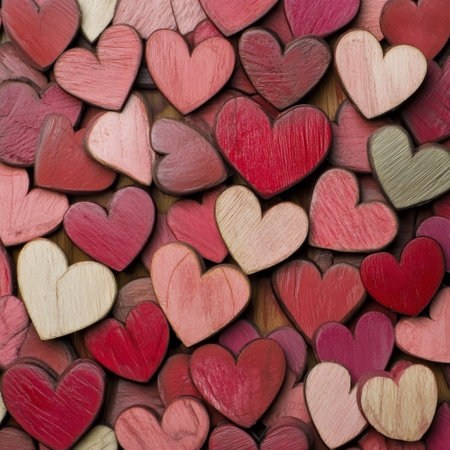 A collection of wooden hearts in different shades of red and pink is displayed, showing their unique textures and shapes. This arrangement is perfect for crafts or festive decor.