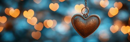 A shiny key shaped pendant dangles from a red heart attached to a branch. Soft golden sunset light creates a dreamy and romantic atmosphere with blurred hearts glowing in the background.