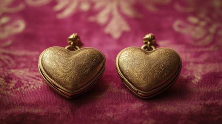 This stunning photograph showcases two elegant heart-shaped lockets with intricate patterns in gold, beautifully set against a rich pink background, evoking romance and nostalgia.