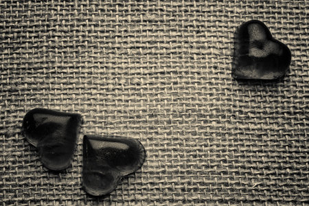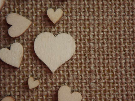 wooden hearts of different sizes on jute fabric as a Valentines day greeting card. High quality photo