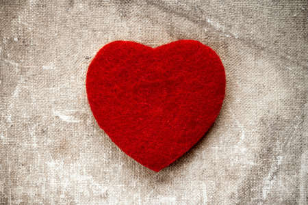 Heart made of cloth on wood desk. Valentine day. Holidays card with copy space
