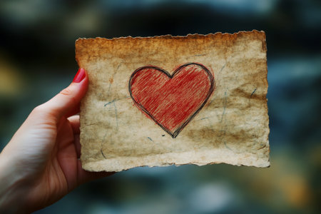 A hand presents a piece of aged paper featuring a hand-drawn red heart. The background is softly blurred, emphasizing the love symbol on the paper.
