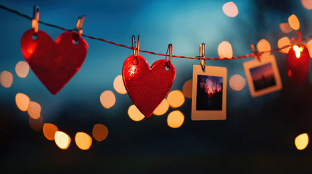 Red hearts hanging on clothesline with photo frames on bokeh background