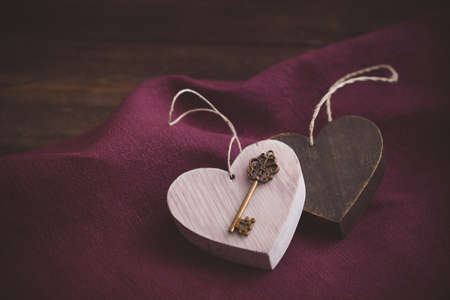 Vintage Valentine wooden hearts with a magic key on the dark red napkin ith a brown background