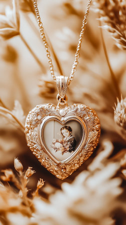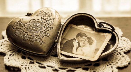 A heart-shaped locket holds a vintage photo, set against a soft floral background for added sentiment.