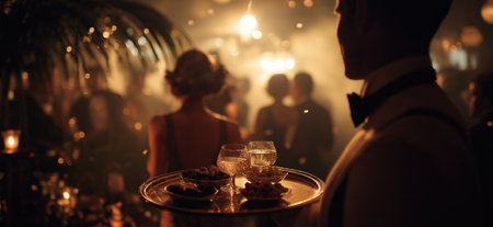 Waiter carrying a silver tray with drinks and food at a blurred, elegant party scene. Waiter carrying tray at glamorous party