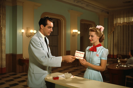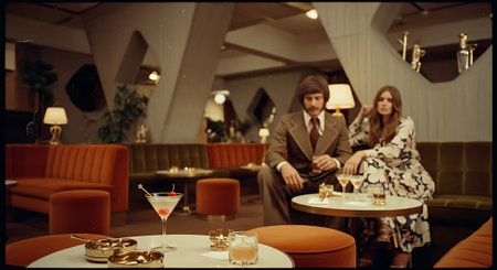 A stylish couple enjoying cocktails in a retro lounge with sophisticated decor