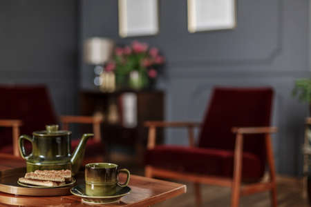 Close-up of green jug, tea cup and cookies placed on table in the blurred background photo of grey sitting room interior with two armchairs