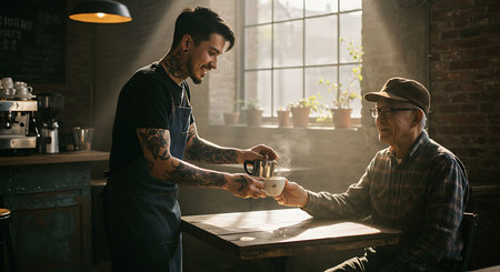A bearded man wearing a hat and apron smiles warmly while engaging in conversation at a cozy caf