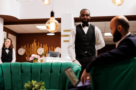 Bellboy assisting businessman in lobby, provide excellent services while he waits for room to be ready for check in. Entrepreneur killing time on laptop, writing presentation for important meeting.