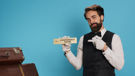 Elegant bellboy has conference room symbol in hand, showcasing wall pointer to lead hotel guests to all area on the premises. Experienced porter posing with an indicator wall sign.