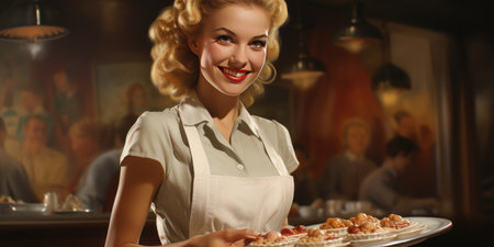 Young waitress serving a dessert in a vintage cafe, her colleague waiting inside. Ai generated image