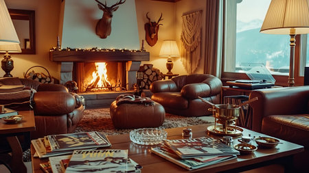 Luxury living room interior with fireplace, sofa, coffee table and book. Vintage style.