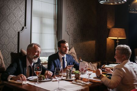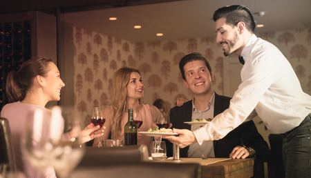 From the back of waiter. Family friends having nice time in beautiful luxury modern restaurant.