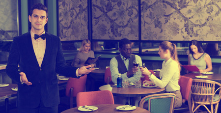 Polite young waiter bringing ordered dishes to guests at restaurant