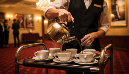 Medium shot showing a server refilling coffee cups at a theater lobby with guests and décor blurred out to keep attention on the action.