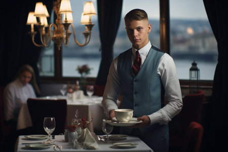 Elegant waiter holding a tray with four teacups and saucers in a sophisticated setting to serve tea