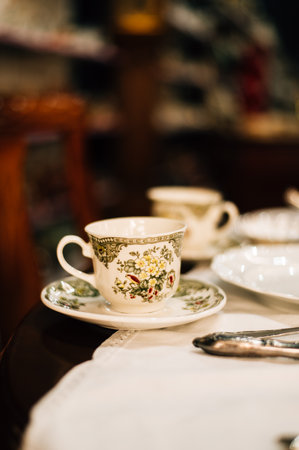 A delicate tea cup with gold accents sits on a matching saucer in a cozy cafe