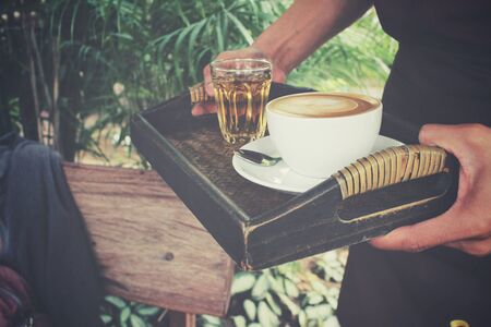 Pleasant smiling hotel worker offering free coffee to tired guest waiting for check-in process in lobby, waiter serving cappuccino to tourist arriving at resort. Customer service in hospitality