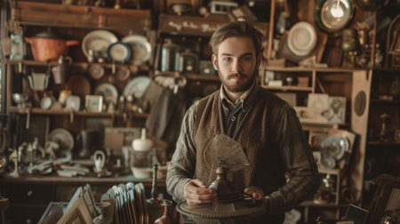 The picture of the antique dealer that working inside the old vintage shop that selling, buying or appraisal the antique, old, retro, classic object in the past but still valuable and elegant. AIG43.