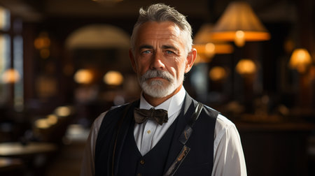 a man holding a silver platt in a dark room with white tablecloths and chandels on the walls. Generative Ai