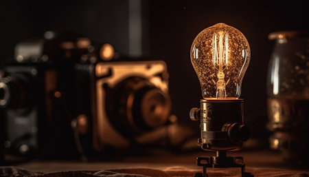 Antique electric lamp illuminates old fashioned photography studio equipment generated by artificial intelligence