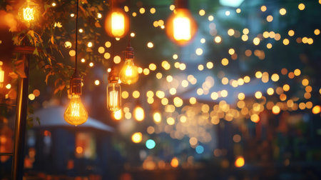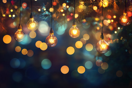 Softly glowing, hanging vintage-style light bulbs illuminate a magical festive scene. warm bokeh lights in the background create a beautiful and cozy winter wonderland atmosphere, perfect for holiday celebrations, festive decorations, and seasonal displays. Generative AI