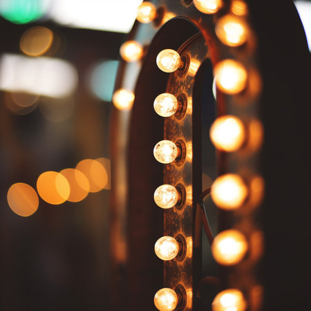 Retro lightbulb border sign on vintage cinema-style storefront under marquee lights