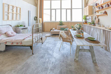 simple cozy home interior of an open plan ordinary room with a kitchen and bedroom area