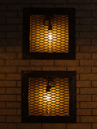 Glowing home decorations. Two retroes, old lamps behind bars on