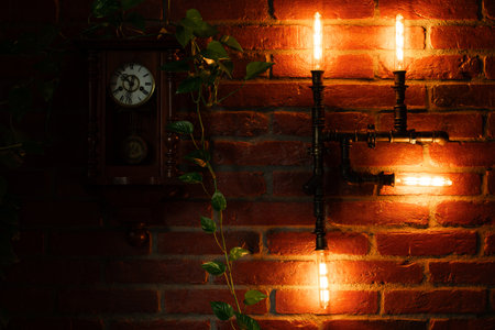dusk indoor loft interior design wall warm lamp illumination, vintage clock and long plant with brick background space