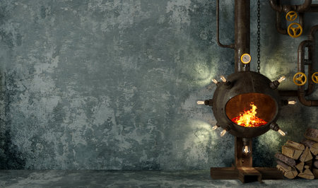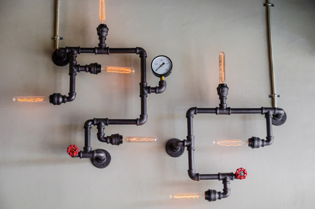 Steampunk decor. With iron pipes. and incandescent lamps. Loft style wall and steampunk pipes.