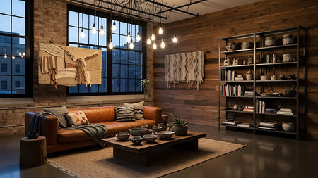 An industrial loft living room with exposed brick and wood paneling. A comfortable brown leather sofa is adorned with patterned pillows and a knitted blanket. A wooden coffee table holds various bowls and decorative items. A tall metal bookshelf is filled with books and pottery, illuminated by pendant lights.