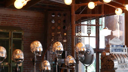 BANGKOK, THAILAND - 10 JULY, 2019: The camp vintage flea market near Chatuchak. Modern design of retro style boutique art shop of old antiques. Decoration of popular strange fashion city landmark