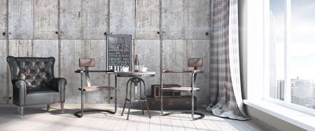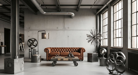3D rendering of a loft living room with a brown leather sofa