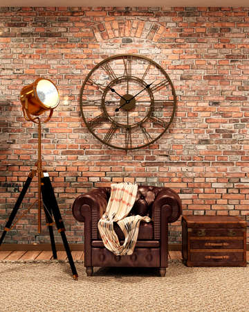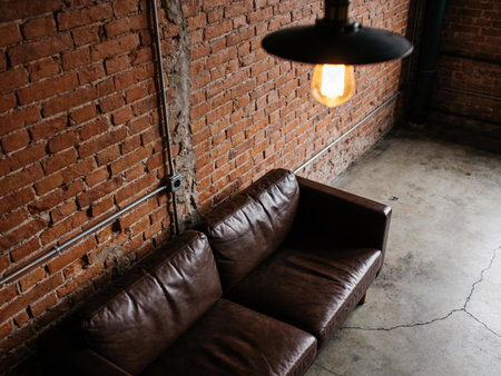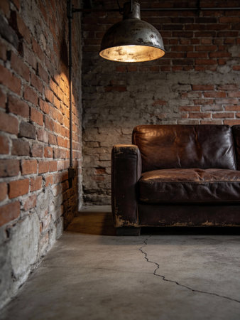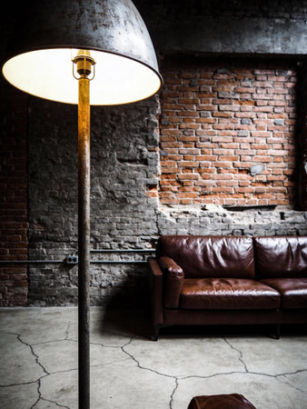 Loft style living room with leather sofa, lamp and brick wall
