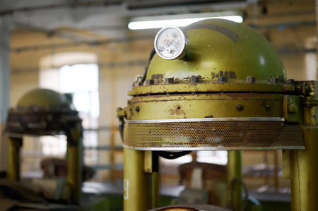 old heating system of an industrial building with many pipes and pressure gauges