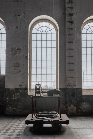 High arcade window in an old factory. Rusted, industrial space, dirty walls and historical floor tiles. Old, metal cart with an old fashioned wire processing machine and cable coil on it.