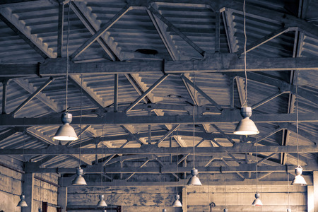 Architectural industrial background. Ceiling, roof and lighting of an old abandoned factory building or warehouse