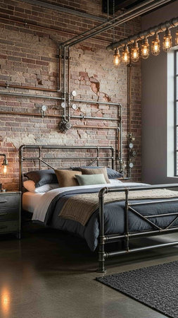 A modern industrial-style bedroom with a metal bed and brick wall