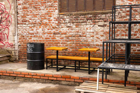 Stylish brick wall in retro style with a table standing next to it, illuminated by a lamp