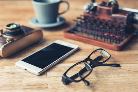 Old retro typewriter, alarm clock and camera on a wooden background top view