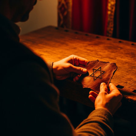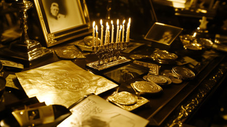 A still life photo featuring a Star of David on a golden plate surrounded by candles, an old book, and other religious artifacts. The image highlights Jewish symbolism and spiritual tradition.