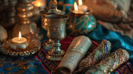 A beautifully arranged scene showcases a traditional menorah beside aged scrolls and a rustic Star of David made from twine, all resting on a weathered blue table. The warm tones and intricate details evoke a sense of reverence and connection to Jewish heritage, inviting contemplation of faith and tradition.