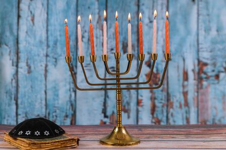 Jewish menorah with burning oil candles and kippah with totah for Hanukkah. Jewish holiday.
