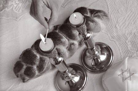 Shabbat eve table.Woman hand lit Shabbath candles with uncovered challah bread and kippah. (BW)