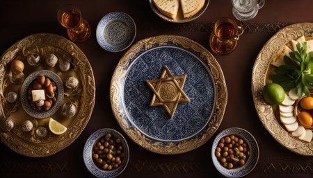 A beautifully arranged Seder plate with the traditional items used during the Passover Seder, including matzah, maror, charoset, egg, parsley, and a Star of David.