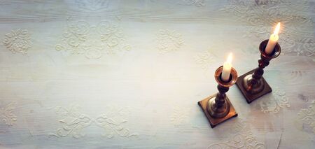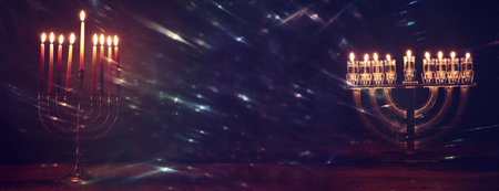 Low key image of jewish holiday Hanukkah background with menorah (traditional candelabra) on dark toned foggy background